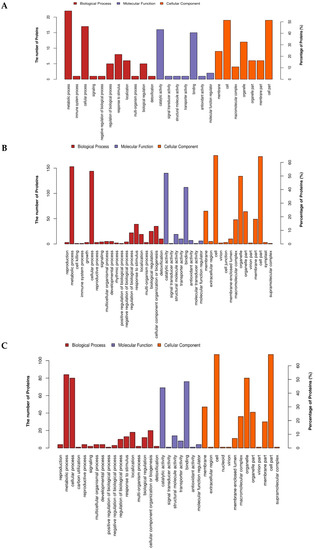 Gene ontology (GO) functional classification of drought responsive proteins. (A) YE8112 specific DAPs; (B) SD_TD specific DAPs; and (C) MO17 specific DAPs. Y-axis represents the number (and%) of proteins in each function; X-axis displays the protein functions, categorized into three broad biological functional groups.
