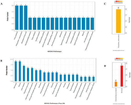 KEGG pathway enrichment analysis of the DAPs. (A) TD_TC comparison; (B) SD_SC comparison. The whole number above the bar (blue) graph represents number of DAPs enriched in the corresponding pathway. (C) Most significantly enriched pathway in TD_TC. (D) Most significantly enriched pathways in SD_SC based on the hypergeometric test. The significance of the enrichment of the KEGG path is based on the Student’s t-test, p < 0.05. The color gradient represents the size of the p value; the color is from orange to red, and the nearer red represents the smaller the p value, the higher the significant level of enrichment of the corresponding KEGG pathway. The label above the bar graph shows the enrichment factor (rich factor ≤ 1), and the enrichment factor indicates the number of differentially abundant proteins participating in a KEGG pathway as a proportion of proteins involved in the pathway in all identified proteins.