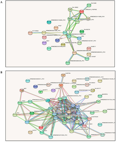 Proteins in the cell are usually found as complexes, and biological processes within the cell are controlled by interactions between various proteins [119]. Therefore, identifying potential protein partners and studying protein–protein interactions becomes imperative for drought stress response research. Here, we used String 10.5 database analysis to determine how the identified differentially abundant proteins interact with others in networks to effect specific cellular functions. Some of the drought responsive proteins were predicted to interact with each other and hold central positions in certain PPI networks whereas some nodes showed no direct connections (Figure 7). The linkages created by these identified proteins in interaction networks can provide deeper insights into their relative importance in biological processes. ‘Protein hubs’ (connected to various other proteins) such as uncharacterized protein (Zm45026) in YE8112 and elongation factor 1-alpha (GRMZM2G343543_P03) in MO17; and ‘bottlenecks’ (key connectors of sub-networks), such as electron transporter/thiol-disulfide exchange intermediate (GRMZM5G869196_P01) in YE8112 and hypothetical protein LOC100383576 (AC234515.1_FGP003) in MO17 represent central points for communication co-ordination within the interaction network and tend to play critical roles in drought stress responses.