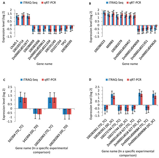 Confirmation of iTRAQ-seq results by quantitative real-time PCR (qRT-PCR). Quantitative RT-PCR analysis of the expression patterns of the maize seedling leaf genes encoded by differentially abundant proteins (DAPs) from different comparisons: (A) DAPs specific to TD_TC; (B) DAPs specific to SD_TD; (C) DAPs shared between TD_TC and SD_TD; and (D) Common DAPs shared between TD_TC and SD_SC. The y-axis represents qPCR relative expression levels (log2-fold change) and fold-change of the iTRAQ-seq data. All genes with negative values of expression level means that they were down-regulated in response to drought stress. Maize gene GAPDH (accession no. X07156) was used as the internal reference. Error bars represent the SE (n = 3).