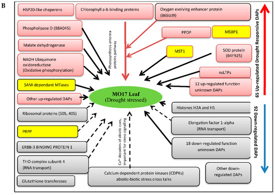 Among the dominating up-regulated DAPs in MO17, we observed heat shock proteins (HSP 20-like chaperons superfamily), chaperon DNA-J domain superfamily proteins and ribosomal proteins (50S Ribosomal protein L20) (Table 3). Molecular chaperons facilitate the stabilization of other macromolecular structures, including other proteins, under stress conditions [80]. Precisely, heat shock proteins (HSPs) are vital in protecting plants against stress by preserving other proteins in their functional confirmations [103]. HSPs have been greatly accumulated in alfalfa (Medicago sativa L.) leaves in response to salinity stress [104]. As anticipated, the increased accumulation (up-regulation) of HSPs could be regarded as a crucial defensive response of MO17 against drought stress. Additionally, ribosomal proteins (40S, 50S, and 60S) are an integral component of stress-defense protein biosynthesis machinery [105], hence were up-regulated under drought stress. Similarly, Ziogas et al. [106] found out that the 40S and 60S ribosomal proteins were up-regulated in citrus response to PEG-induced osmotic stress.