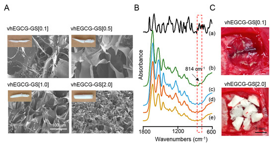 Macroscopic images of vhEGCG-GS[0.1 to 2.0] are illustrated in Figure 1A (upper left). All sponges exhibited similar length while the thickness of the sponges gradually increased in a dose-dependent manner with an increase in gelatin. The porous structure of the sponges was evaluated by using a field emission scanning electron microscope (FE-SEM). The pore size of vhEGCG-GSs gradually decreased with an increase in the content of gelatin (Figure 1A). The spectra of vhEGCG-GSs were analyzed by using attenuated total reflection FTIR spectroscopy to confirm the existence of EGCG. Specific EGCG peak at 814 cm−1 was identified in the spectra of all vhEGCG-GSs compositions [27]. These results suggest that all vhEGCG-GSs compositions successfully contained EGCG even though their architecture was different.