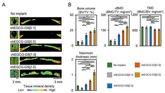 (A) Vertical and lateral tissue mineral density image of the defects with or without vhEGCG-GSs treatment after 4 weeks of implantation. No implant indicates bone defect without any implantation of sponges. (B) Histomorphometric data of defects: Bone volume (BV) per total volume (TV); vBMD: Bone mineral content (BMC) per TV, TMD: BMC/BV, Maximum thickness of mineralized tissue. * p < 0.05; ** p < 0.01 (analysis of variance (ANOVA) with Tukey-Kramer test). Data shows mean with standard deviation (S.D.) (n = 4, 4 rats per group).