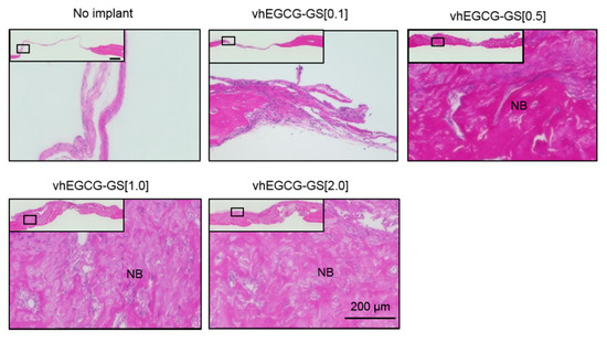 The critically sized defect (9 mm) of calvaria in Sprague Dawley rats (male, eight weeks old) was used to prepare the regenerated bone formed by vhEGCG-GSs. Following surgery, vhEGCG-GS[0.1] readily shrank due to the body fluid and was, thereby, unable to cover the defect while all other sponges covered the defects (Figure 1C). Figure 2 represents the tissue mineral density image and bone histomorphometric data of defects treated with or without sponges after 4 weeks of implantation. The implantation of vhEGCG-GS[0.1] and negative control did not form remarkable radiopacity in the defects. However, implantations with vhEGCG-GS[0.5, 1.0, and 2.0] mostly covered the entire defects within 4 weeks (Figure 2A). H-E staining verified that the radiopacity images were newly formed bone tissue (Figure 3). The bone volume (bone volume/total volume: BV/TV), vBMD (bone mineral contents/TV), and maximum thickness of the regenerated bone increased with incremental doses of gelatin in the vhEGCG-GSs. Meanwhile TMD (BMC/BV) slightly decreased in the defects treated with vhEGCG-GS[1.0 and 2.0]. These results suggest that the amount of gelatin in vhEGCG-GSs sensitively affected the bone formation and BMDs.