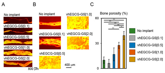 A previous study reported that bone substrate and no-bone substrate can be distinguished on the basis of the fluorescence image of H-E staining [28]. We evaluated the porosity of the regenerated bones employing this technique. Figure 4A,B illustrates the fluorescence image of defects with and without sponge treatments. Cavities containing gelatin, bone marrow, and connective tissue were observed as red and bone substrate was observed as yellow in the images. An increased amount of gelatin in vhEGCG-GSs significantly elevated the cavity (red) in the regenerated bone, which suggests that the amount of gelatin in vhEGCG-GS altered porosity of the regenerated bone (Figure 4C).