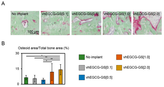 V.Goldner staining was used to distinguish osteoid and mineralized bone tissue. Osteoid was observed as red and mineralized bone tissue was observed as green [29]. Furthermore, we evaluated the osteoid volume in regenerated bones after four weeks of implantation (Figure 5). Osteoid tissue was higher in defects treated with vhEGCG-GS[1.0 and 2.0] than defects treated with vhEGCG-GS[0.1 and 0.5] and defects without implantation, which suggests that the bone formation was more advanced in the defects treated with vhEGCG-GS[1.0 and 2.0].