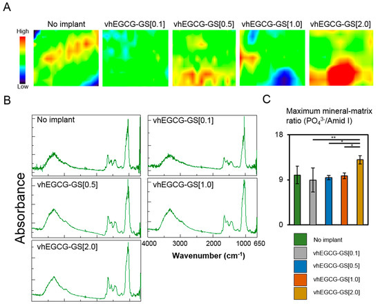 FTIR image (A), spectra (B), and quantitative data (C) of regenerated bone in the defects treated with or without vhEGCG-GSs after four weeks of implantation. (A) Distribution of mineral-matrix ratio: PO43−/amide I. Color scale: PO43−/amide I ratio calculated using pixel values. Scanning area: 187.5 μm × 100 μm. (B) Representative spectra of the point exhibiting maximum data of mineral-matrix ratio in the images. Mineral area (PO43−; 915–1215 cm−1). Matrix area (Amide I; 1601–1714 cm−1). (C) Quantitative data of maximum mineral-matrix ratio. * p < 0.05; ** p < 0.01 (ANOVA with Tukey-Kramer test). Data shows the mean with S.D. (n = 4: ROI from two rats per group).