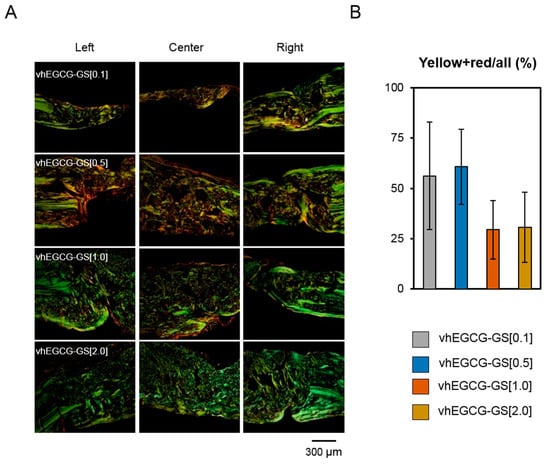 Picrosirius-red stained sections observed under polarized light (A) and quantitative data (B) of the defects treated with vhEGCG-GSs after four weeks of implantation. Green: immature (thin) type 1 collagen. Yellow-red: mature (thick and packing) type 1 collagen. (B) Ratio of mature collagen (yellow-red) per total collagen (yellow, green, and red). (ANOVA with Tukey-Kramer test). Data shows the mean with S.D. (n = 6: 2 central parts and four marginal parts of the defects from two rats per group).