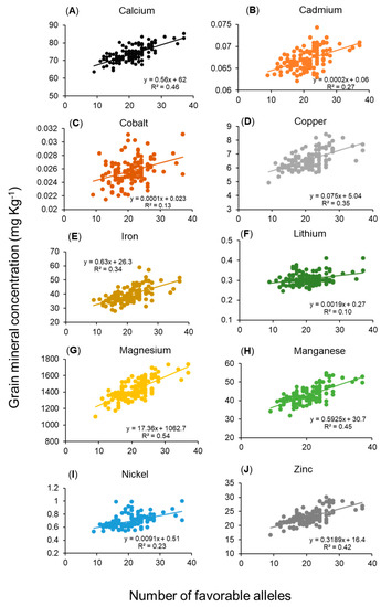 2.5. Relationship Between Grain Mineral Concentrations and Number of Favorable Alleles