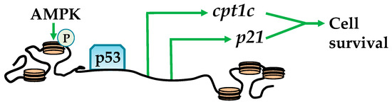 Bioinformatic analysis has identified several histones that contain an AMPK phosphorylation consensus sequence. These include: H1FX, H2AFX, H2AFY, H2AFY2, H2AFZ, H2BFM, and H3F3B [25], suggesting that AMPK plays an important role in epigenetic regulation through histone phosphorylation. Ultimately, such histone phosphorylation promotes cross-talk between epigenetic regulators to facilitate spatio-temporal nucleosome structural changes that influence transcriptional machinery [24]. For example, activation by glucose deprivation or UV radiation results in the colocalization of AMPK and phosphorylating serine 36 in H2B (H2BS36) throughout the carnitine palmitoyltransferase 1C (CPT1C) and cyclin-dependent kinase inhibitor (p21) promoter regions and gene bodies. This exposes TP53 or tumor protein (p53) DNA binding sites and subsequent association with RNA polymerase II (Figure 1) [26,27]. These events enhance CPT1C and p21 expression, which play a role in cellular survival via activating autophagy and transporting long-chain fatty acids to the mitochondria, collectively enhancing β-oxidation and energy production [28,29,30]. Related to cellular survival, charged multivesicular body protein 1B (CHMP1b) is phosphorylated by AMPK, forms a “shell” around nucleosomes enriched with H3 phosphorylation and acetylation, and influences gene transcription [25]. This might play a role in the transition of active and inactive nucleosome regions and potentially heritable epigenetic marks [31].