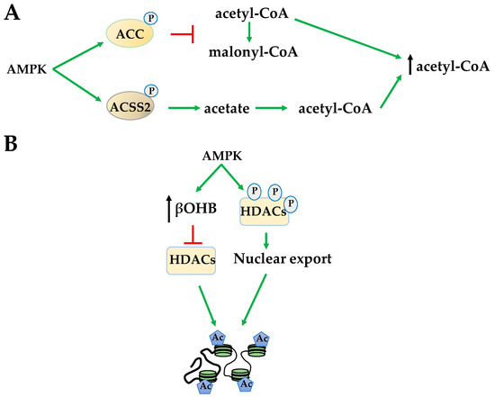 AMPK activation increases acetyl-CoA and promotes histone acetylation. (A) Through phosphorylation, AMPK inhibits acetyl-CoA carboxylase (ACC) while activating acetyl-CoA synthetase short-chain family member 2 (ACSS2) to increase acetyl-CoA availability for acetylation; (B) AMPK increases β-hydroxybutyrate (βOHB) to inhibit histone deacetylases (HDACs) and promotes HDAC nuclear export via hyperphosphorylation. Both of these events increase histone acetylation.