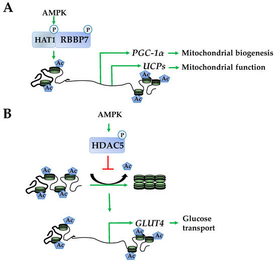 Investigations into epigenetically regulated networks identified HAT1 and retinoblastoma binding protein 7 (RBBP7) as direct targets of AMPK that dimerize following phosphorylation. This results in enhanced euchromatin structure at the promoters of peroxisome proliferator–activated receptor gamma coactivator–1α (PGC-1α), transcription factor A (Tfam), nuclear respiratory factors 1 and 2 (NRF1 and NRF2), and uncoupling proteins 2 and 3 (UCP2 and UCP3). The corresponding induction of these genes produces enhanced mitochondrial function (Figure 3A) [13]. In addition to HAT1 and RBBP7, AMPK phosphorylates HDAC5, promoting its dissociation from the promoters releasing its suppressive effects to increase expression of an array of metabolic genes, including glucose transporter type 4 (GLUT-4) (Figure 3B) [43].