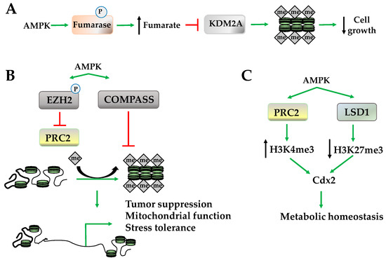 AMPK regulates histone methylation. (A) AMPK phosphorylates fumarase increase fumarate, which inhibits lysine-specific demethylase 2A (KDM2A), increasing histone methylation at cell growth; (B) AMPK decreases histone methylation through inhibition of polycomb repressive complex 2 (PRC2) and complex proteins associated with set1 (COMPASS complex); (C) AMPK modulates histone 3 methylations status to increase caudal type homeobox2 [cell differentiation]) (Cdx2) expression and metabolic homeostasis. LSD1: lysine-specific histone demethylase-1; EZH2: zeste homolog 2.