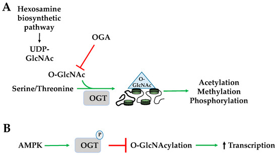 AMPK regulates histone O-GlcNAcylation and ADP-ribosylation. (A) O-GlcNAc transferase adds O-GlcNAc to a serine or threonine to produce O-GlcNAcylation. Nutrient and stress sensor stimulates hexosamine biosynthetic pathway (HBP) to create UDP-GlcNAc, which is a donor substrate for O-GlcNAcylation. Histone O-GlcNAcylation regulates acetylation, methylation, and phosphorylation; (B) AMPK phosphorylates O-GlcNAc transferase and inhibits O-GlcNAcylation to increase transcription. OGA: O-GlcNAcase; OGT: O-GlcNAc transferase.