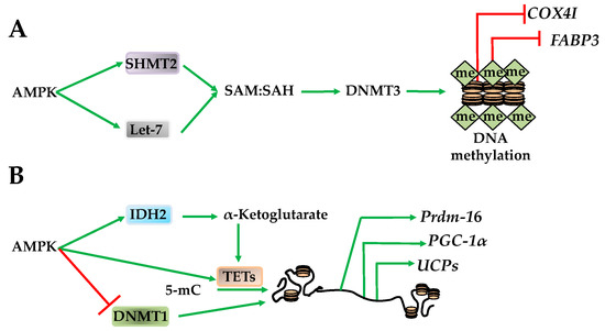 AMPK regulates DNA methylation. (A) AMPK activates serine hydroxymethyltransferase 2 (SHMT2) and Let-7 to increase SAM:SAH ratio providing substrate for DNA methyltransferase 3 (DNMT3) methylation of promoters such as COX4I and FABP3; (B) AMPK directly regulates isocitrase dehydrogenase 2 (IDH2) to yield α-ketoglutarates to promote ten-eleven translocation hydroxylases (TETs) activation. AMPK likely also directly regulates TETs catalyzing the conversion of 5-mc to unmethylated cytosine while inhibiting DNA methyltransferase 1 (DNMT1). These actions result in decreased promoter methylation of PR domain containing 16 (Prdm16), PGC-1α, and the uncoupler proteins.