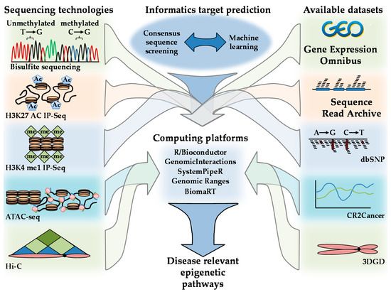 Scientific advances in the computational and Big Data arenas have resulted in novel experimental approaches, databases, and bioinformatics techniques that can be used in the exploration of AMPK epigenetic-regulated signaling pathways. Examples of tools used to explore chromatin characteristics include H3K27 acetylation H3K4 and monomethylation (H3K4me1) immunoprecipitation sequencing (IP-Seq); assay for transposase-accessible chromatin using sequencing (ATAC-seq); assay for transposase-accessible chromatin using sequencing (ATAC-seq); and Hi-C [72]. The relationship between DNA, histone modifications, histone remodeling, followed by Hi-C structural mapping, provides an integrative understanding of how AMPK can influence chromatin architecture. The identification of AMPK-regulated networks can be explored using consensus sequence mapping and machine learning in computing environments such as R/Bioconductor computing [25,73,74,75]. The expression of effected genes and loci and their application of these loci to disease-relevant stimuli can be further explored via cross-referencing with expression profiles housed in the Gene Expression Omnibus (GEO) database, Sequence Read Archive (SRA), Single Nucleotide Polymorphism database (dbSNP), 3D Genome database C (3DGD), and CR2Cancer [76,77,78,79]. Integration of these datasets can provide a comprehensive picture of the influence AMPK has on epigenetic signaling cascades in addition to their genetic loci and disease-specific regulation (Figure 7).