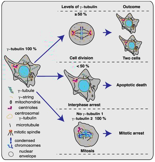 Although γ-tubulin was regarded as a low-abundant protein when first discovered [], today it is known that γ-tubulin is ubiquitously expressed in mammalian cells and appears in abundance in all cellular compartments [,,,,,,,,]. In human and mouse cell lines, targeting the TUBG1 and TUBG2 with a single-guide (sg) or with short interference (si) RNA techniques induces a 50% drop in the levels of γ-tubulin protein, which leads to apoptotic death (Figure 1) [,,,]. The live imaging of TUBG sgRNA-expressing cells has demonstrated that when the levels of γ-tubulin decrease, cells divide normally for several days but subsequently they arrest in the interphase and die [].