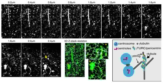 Z-stack images captured by Airyscan super-resolution microscopy, a technique known to improve the signal-to-noise detection of the faintest signals emitted by thin γ-strings (Ø 4–6 nm), were analyzed and, thereafter, 3D-skeleton images were generated by applying a 3D thinning algorithm to locate the centerlines (skeleton) of the structures in the input images []. This approach demonstrated that links are established between γ-strings, γ-tubules, and centrosomes (Figure 2). Considering that interlinking between filaments is the key to the formation of a skeleton, we propose that cellular γ-tubulin forms a meshwork.