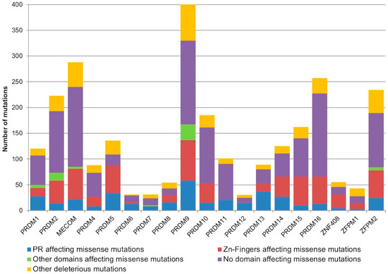 Overall, we identified 3995 point mutations, 180 deletions (39 in-frame and 141 frameshift), and 22 insertions (16 in-frame and 6 frameshift) affecting PRDM genes. Silent or synonymous mutations were 1531 (26.7% of total mutations) and ranged between 11% (PRDM6) and 41% (PRDM8) of the total mutations for each gene (Figure 1).