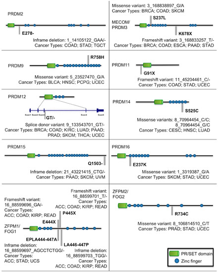 Our reanalysis of the TCGA Exome-sequencing datasets revealed PRDM2, PRDM3/MECOM, PRDM9, PRDM16 and ZFPM2/FOG2 as the most mutated genes. Heterogeneity in the mutation frequencies was observed in the different tumor types with higher mutation rates found for PRDM3/MECOM, PRDM8, PRDM9, PRDM15, ZFPM1/FOG1 and ZFPM2/FOG2 in specific cancers. Remarkably, VEP analysis indicated that the percentage of total deleterious mutations across the tumor samples was high for most genes. More interestingly, a random sampling weighted on the size of the annotated protein domains demonstrated that deleterious mutations were significantly enriched in the PR domain of PRDM1, PRDM5, PRDM6, PRDM8, PRDM9, PRDM12 and PRDM13. Frequent mutations disrupting the PR domain in tumor samples would be a mechanism for removing the tumor suppressor function of the PR-plus isoform in favor of the oncogenic PR-minus form.