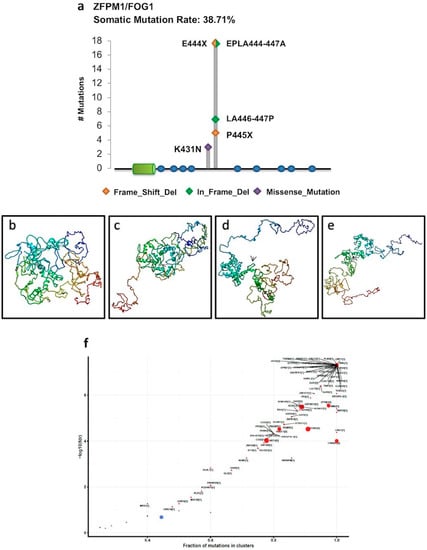 (a) ZFPM1/FOG1 hotspot mutations in ACC obtained by Lollipop plot visualization function. These hotspot mutations are all localized outside the PR domain (green cylinder) and Zinc fingers (blue dots) (b–e) I-TASSER predicted tertiary structures of the annotated ZFPM1/FOG1 canonical protein (b) and ZFPM1/FOG1 proteins carrying the mutations ELPA444-447A (c), LA446-447P (d), and K431N (e); the arrows show the mutated protein regions. (f) The scatter plot shows the results of the OncodriveCLUST algorithm analysis for ACC. The dimension of the dots is proportional to the number of clusters found in a certain gene, also indicated in the squared bracket. Specifically, in the ZFPM1/FOG1 locus, two mutation clusters were found (fdr < 2.87 × 10−6).