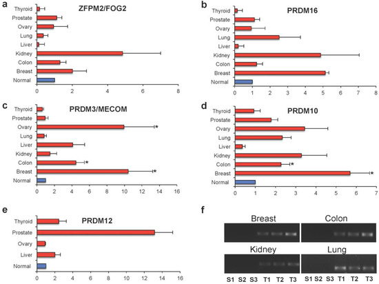 Relative expressions obtained by real-time PCR in different types of cancer tissues versus corresponding normal tissues (with arbitrary expression value equal to 1). The comparative threshold cycle (Ct) method was used with β-actin as the internal control. The results are expressed as the mean ± ES. The statistical significance of differences between experimental groups was calculated using the unpaired two-tailed Student’s t-test. (*) Results with a p-value < 0.05 were considered significant. (a) ZFPM2/FOG2; (b) PRDM16; (c) PRDM3/MECOM; (d) PRDM10; (e) PRDM12. (f) Representative samples analyzed for PRDM12 by agarose gel electrophoresis.