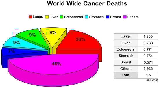 Cancer is a public health problem and one of the leading causes of death worldwide, claiming annually more than 8 million lives [,]. The International Agency for Research on Cancer (IARC) reported there were 8.2 million cancer deaths worldwide in 2012 and predicted it will increase up to 13 million by 2030 (Figure 1).