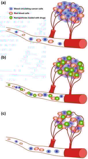 The angiogenesis process and treatment of tumors via nanoparticle delivery. (a) Angiogenesis; (b) Drug delivery through NPs; (c) Tumor reduction.