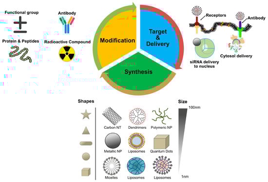 NPs are promising drug carriers because of their ability to deliver hydrophobic and/or hydrophilic drug molecules, peptides, small molecule drugs, or antibodies to the tumor site with minimum toxicity to surrounding tissues; this safe delivery is based on their penetration capacity []. The potential anticancer properties of chemotherapeutic agents’ ability and delivery have been explored using various kinds of NPs, including particularly liposomes, polymeric NPs, PMs, dendrimers, carbon NPs, polymer-drug conjugates, nanoemulsions, CNTs, quantum dots and inorganic NPs (Figure 3). Recently, theranostic nanocarriers have shown much interest for various treatment due to their ability to execute simultaneous functions at targeted diseased sites. Nanotheranostic carriers composed of metallic or magnetic nanoparticles. In addition, we explained not only combinatorial aspects of nanoparticles but also the mode of action individual cytotoxic agent. Herein, we explained not only combinatorial aspects of nanoparticles but also the mode of action individual cytotoxic agent.
