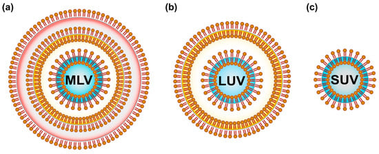 Classification of liposomes based on the lamellarity: (a) Multilamellar vesicles (MLV) are composed of many lipid bilayers and range from 1–5 µm in size; (b) Large unilamellar vesicles (LUV) are in the size range of 100–250 nm with a single lipid bilayer; (c) Small unilamellar vesicles (SUV) consist of a single phospholipid bilayer surrounding an aqueous phase with a size range of 20–100 nm.
