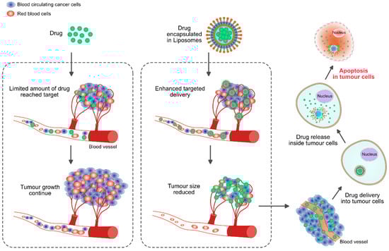 The emergence of nanotechnology has made a significant impact on clinical therapeutics in the last two decades. Liposomes and polymeric nanoparticles have been used as nanoscale drug carriers for more efficient and safer delivery of innumerable drugs. Among different varieties of NPs, the liposomes are the most established drug-delivery vehicle, with many clinical products available to date. Liposomes consist of amphiphilic lipid molecules that assemble into bi-layered spherical vesicles [,]. Liposome-mediated drug delivery is an improvement due to their efficiency, bio-compatibility, non-immunogenicity, enhanced solubility of chemotherapeutic agents and their ability to encapsulate a wide array of drugs []. Furthermore, liposomes have shown tremendous therapeutic potential as carriers for payloads and for delivery to targeted sites []; liposome-mediated drug delivery systems improve the pharmacokinetic and pharmacodynamic profiles of the therapeutic payload, promote controlled and sustained release of drugs and exhibit lower systemic toxicity compared with the free drug []. For instance, polyethylene glycol (PEG)-coated liposome-mediated drug delivery increased the in vivo circulation half-life of liposomes from a few hours (h) to approximately 45 h []. At present, different liposomal products being used for cancer treatment include Doxil, DaunoXome®, DepoCyt® and ONCO-TCS, which are liposomal formulations of doxorubicin (DOX), daunorubicin, cytarabine and vincristine, respectively [,,,,,]. Lammers et al. (2009) demonstrated that simultaneously delivering multiple chemotherapeutic agents to tumors in vivo using HPMA-based polymer-drug conjugates carrying 6.4 weight % of gemcitabine, 5.7 weight % of DOX and 1.0 molar % of tyrosinamide. The resulting construct, poly(HPMA-co-MA-GFLG-gemcitabineco-MA-GFLG-DOX-co-MA-TyrNH2), was shown to be effective at killing cancer cells under in vitro conditions; additionally, circulating time was prolonged and localization efficiency to inhibit tumor growth was very selective []. Regarding liposome-mediated therapy, various strategies have been adopted for passive targeting of liposomes to the tumor sites by using PEG and active targeting of cancer cell surface receptors, FRs, TfR and EGFRs and the tumor microenvironment including VEGF, VCAM, matrix metalloproteases, αβ-integrins and surface grafting of liposomes with aptamers []. Use of nanotechnology could improve the pharmacokinetics and reduce side effects associated with drugs.