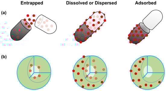 Encapsulation mechanism models: drug entrapped in, dissolved in, or dispersed within and adsorbed on: (a) nanocapsules and (b) nanospheres [].