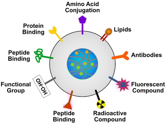 Metallic NPs (MNPs) have been used widely in biomedical sciences and engineering. In order to use them for different biomedical applications, these MNPs can be synthesized and modified with various chemical functional groups []. MNPs have an average size between 1 and 100 nm. Based on size, they are classified into four types: MNPs (0D), metallic nanowires and rods (1D), metallic sheets and platelets (2D) and metallic nanostructures (3D). MNPs exhibit unique shape- and size-dependent optical properties. Among several MNPs, Ag, Au, palladium, platinum, iron oxide, zinc oxide, nanoshells and nanocages play an important role in biomedical applications. Advancements in nanotechnology have also enabled us to modify the surface of NPs with different moieties including functional and chemical groups, biological molecules and radioactive agents according to target applications (Figure 7).