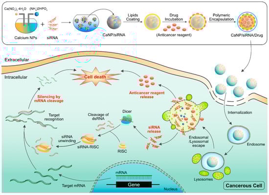 Combined nano-therapy strategy of CaP nanoparticles containing siRNA and anticancer reagent and their therapeutic effect in cancerous cell. CaP nanoparticles which were assembled with siRNA targeting specific genes is coated with lipids, followed by co-incubation with anticancer drug. The obtained CaNPs/siRNA/DOX are encapsulated by polymers. Internalized CaNPs/siRNA/DOX into cancerous cell are dissolved in endosomal pH through endosomal/lysosomal escape and then released to cytoplasm. Then, siRNA is processed by dicer and RISC system in cytosol and recognize target mRNA to silence the gene expression. Simultaneously, anticancer drug released functions regarding its biological mechanism. Ultimately, both are purposed to induce cell death.