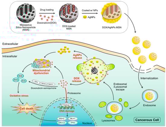 Combined nano-therapy strategy of MSN containing DOX and AgNPs in cancerous cell. MSNs are loaded with DOX then coated with AgNPs. The obtained DOX/AgNPs/MSN is internalized into cancerous cell via endocytosis and then released to cytosol by endosomal pH through endosomal/lysosomal escape. Released AgNPs resulted in mitochondrial dysfunction by inducing ROS production in mitochondria. DOX released accelerate ROS production, followed by induce oxidative stress in cytosol via DOX semiquinone. DOX also is intercalated into DNA that results in DNA damaging by poisoning of topoisomerase II. Both of AgNPs and DOX finally induce cancer cell death through oxidative stress by increasing ROS and DNA damaging in nucleus. Black colored indicates direction of pathway and red color indicates blocking function.