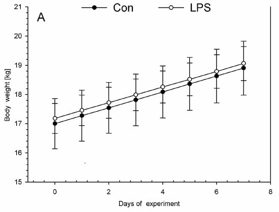 The daily body weights and rectal temperatures in the control group (Con), which received saline, and in the treatment group (LPS), which received lipopolysaccharide (LPS) from S. Enteritidis at a dose of 5 μg/kg body weight (b.w.); n = 5 pigs/group. (A) The body weights were determined once a day in the morning (between 07:00 and 07:30). The first measurement was before premedication and LPS or NaCl administration (day 0), and the final measurement was on the last day of the experiment before antecedent sample collection (day 7). (B) The rectal temperatures were measured in the morning (between 07:00 and 07:30). The first measurement was before premedication and LPS or NaCl administration (day 0), and the final measurement was on the last day of the experiment before antecedent sample collection (day 7). (C) The rectal temperatures in the afternoon (between 17:00 and 17:30). The first measurement was day 0 (in the day of LPS or NaCl administration), the final measurement was on day 6 of the experiment. The body weight per day and rectal temperatures in the morning and in the afternoon were presented as the mean from group ± SD. The results of rectal temperature and body weight were compared between the control and the LPS group using Student’s t-test. The result of rectal temperature and body weight was not statistically significant.