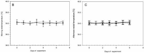 On each day during the experiment, all animals were assessed by a veterinary surgeon as being clinically healthy. All animals in the LPS and control groups were without any symptoms of disease during this investigation. The low dose of LPS S. Enteritidis used in this experiment did not evoke any differences in health status, appearance, temperature, or body weight in animals of the LPS group compared with the control group during the entire period of the experiment. Similar body weights with no significant statistically changes were observed between LPS and control group (Figure 1A). Both in the LPS and in the control group, each measurement of the rectal temperature in the morning (Figure 1B) and in the afternoon (Figure 1C) fluctuated in the normal temperature range of pigs. There were no statistically significant differences in the rectal temperature levels between LPS and the control group.