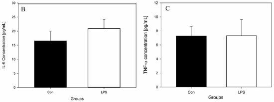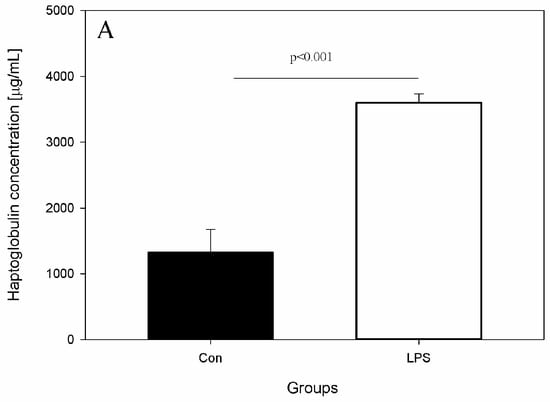 Concentrations of acute phase protein and cytokines in the peripheral blood in the control group (Con), which received saline, and in the treatment group (LPS), which received LPS from S. Enteritidis at a dose of 5 μg/kg b.w.; n = 5 pigs/group. Bars represent mean ± SD (standard deviation). The statistical analysis was performed by one-way analysis of variance (ANOVA) and Tukey’s tests. (A) Serum concentrations of haptoglobin (Hp). The result was statistically different at p < 0.001 as compared with the control group (B) Serum concentrations of interleukin-6 (IL-6). The result was not statistically significant. (C) Serum concentrations of tumour necrosis factor α (TNF-α). The result was not statistically significant.