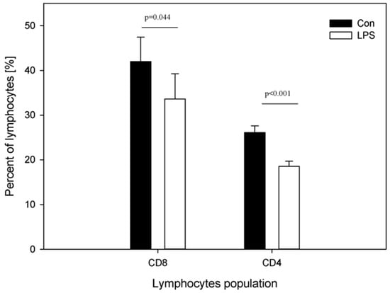 Percentages of CD4 and CD8 T-lymphocytes in the peripheral blood in the control group (Con), which received saline, and in the treatment group (LPS), which received LPS from S. Enteritidis at a dose of 5 μg/kg b.w.; n = 5 pigs/group. Bars represent mean ± SD (standard deviation). The statistical analysis was performed by one-way ANOVA and Tukey’s tests. Statistically different at p = 0.044 (for the percentage of plasma CD8 T-lymphocytes) and p < 0.001(for the percentage of plasma CD4 T-lymphocytes) as compared with the control group. Panels A and B present exemplary dot plots with distribution of CD4 and CD8 T-lymphocytes of the control and treatment group. Samples were stained with FITC Anti-Pig CD4a (BD) and PE Anti-Pig CD8a (BD) and analysed on flow cytometer (Beckman Coulter).