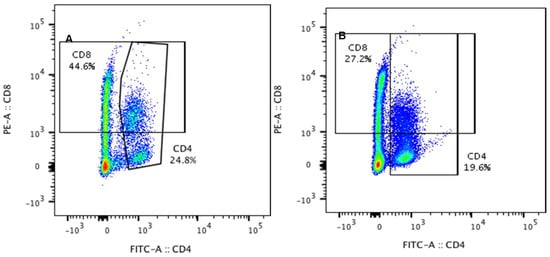 Lymphocytes were stained with fluorescein isothiocyanate (FITC) Mouse Anti-Pig CD4a (cat. no. 559585; BD Biosecinesces, Clone 74-12-4) and phycoerythrin (PE )Mouse Anti-Pig CD8a (cat. no. 559584; BD Biosciences, Clone 76-2-11). Cells were incubated at 4 °C for 15 min, washed with FACS buffer (PBS: 0.1 M phosphate buffered saline, pH = 7.2 supplemented with 5% foetal bovine serum), and centrifuged at 10 °C for 10 min and 413× g (Eppendorf 5418R). The supernatant was removed and the cells were fixed in 2% paraformaldehyde and analysed using a MoFloTM XDP flow cytometer (Beckman Coulter Inc., Miami, Fullerton, CA, USA) equipped with a 488 nm air-cooled argon laser. Forward scatter, side scatter, and green and red fluorescence channels were used to collect specific multi-parameter data from the cells. A total of 50,000 events were collected from each sample. The data were analysed with the Summit 5.2 (Beckman-Coulter Inc., Miami, FL, USA) software package. The gating tree was set as follows: forward-scattered light (FSC)/side-scattered light (SSC) (represent distribution cells on size and intracellular composition) lymphocytes were gated in the range 100–150 kDa, followed by CD4+ and CD8+ [].