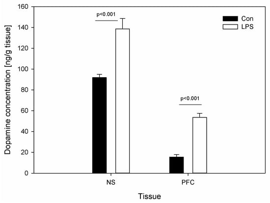 Concentrations of dopamine (DA) in substantia nigra (SN) and in the prefrontal cortex (PFC) in control groups (Con), which received saline, and treatment group (LPS) following the administration of subclinical LPS from S. Enteritidis. Bars represent mean ± SD (standard deviation); n = 5 pigs/group. The statistical analysis was performed by one-way ANOVA and Tukey’s tests. In both SN and PFC, statistically significant differences of DA concentration for p < 0.001 as compared with the control group were observed.