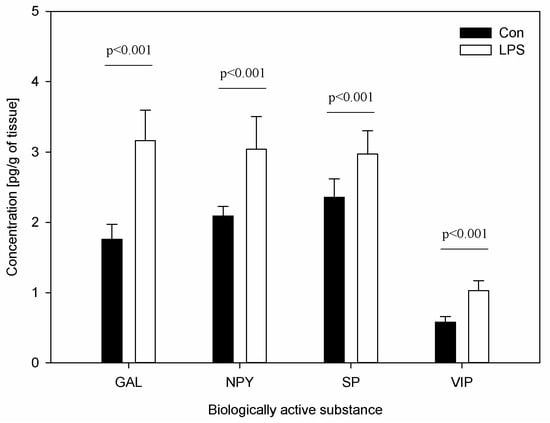 Concentrations of neuropeptides: galanin (GAL), neuropeptide Y (NPY), substance P (SP), and vasoactive intestinal peptide (VIP) in the superficial cervical lymph nodes (scLN). Bars represent mean ± SD (standard deviation); n = 5 pigs/group; Con—the control group, which received saline; LPS—the treatment group, which received LPS from S. Enteritidis at a dose of 5 μg/kg b.w. (in saline solution). The statistical analysis was performed by one-way ANOVA and Tukey’s tests. The results were statistically different at p < 0.001 as compared with the control group.
