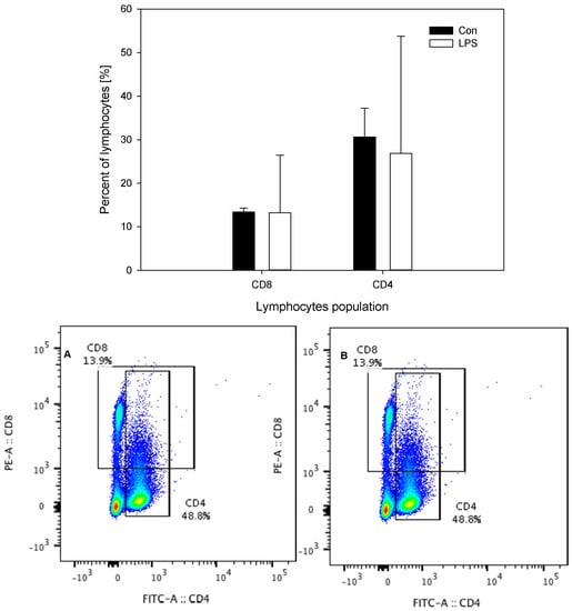 Percentages of CD4 and CD8 T-lymphocytes in the superficial cervical lymph nodes (scLN) in the control group (Con), which received saline, and in the treatment group (LPS), which received LPS from S. Enteritidis at a dose of 5 μg/kg b.w.; n = 5 pigs/group. Bars represent mean ± SD (standard deviation). The statistical analysis was performed by one-way ANOVA and Tukey’s tests. The result was not statistically significant. Panels A and B present exemplary dot plots with distribution of CD4 and CD8 T-lymphocytes of the control and treatment group. Samples were stained with FITC Anti-Pig CD4a (BD) and PE Anti-Pig CD8a (BD) and analysed on flow cytometer (Beckman Coulter).