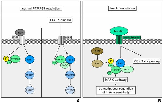 In this review, we highlight the central position of PTPIP51 within the dysregulated MAPK pathway signaling of several disparate diseases. The interactions and thus the functions of PTPIP51 are regulated by the serine and tyrosine phosphorylation status of PTPIP51 [8,9,10,11,12]. It exerts its main function in the MAPK pathway via the binding and stimulation of Raf proteins [7]. As seen in melanoma, the inhibition of the Raf stimulating effect of PTPIP51 can be used as a counter-regulatory mechanism against the BRAF deregulation within the sequence from normal nevi over dysplastic nevi to melanoma. Likewise, mechanisms were seen in breast cancer samples. Here, the observed high Tyr176 phosphorylation prevents the binding and thus the stimulation of Raf-1 via PTPIP51. In these tumors PTPIP51-related signaling represents a counter-regulation against the dysregulated growth and proliferation signaling (ongoing studies of our group). In insulin signaling, not the inhibition but the stimulation of the MAPK signaling via PTPIP51 represents the counter-regulatory mechanism against insulin resistance, showing the importance of the cellular setting in which the signaling takes place.