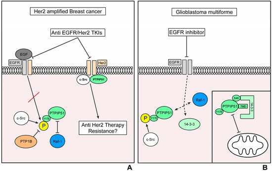 Regulation of PTPIP51 interactions in breast cancer. The inhibition of EGFR in Her2 amplified breast cancer cells induces the same effects as observed in the HaCat cell line upon EGFR inhibition regarding the formation of the Raf-1/14-3-3β/PTPIP51 complex. The sensitivity of Her2 amplified breast cancer cells towards EGFR-targeted TKIs correlates with the regulation of the interaction of PTPIP51 with c-Src. The selective inhibition of Her2 induces a formation of a PTPIP51/Her2/c-Src complex, which depicts a potential resistance mechanism against anti-Her2 therapies (black arrows indicate a phosphorylation/activation, arrows with vertical bar as arrow head indicate an inhibition of interaction/activation) (A); regulation of PTPIP51 interactions in Glioblastoma multiforme. The left side of the figures depicts the regulation of PTPIP51 interactome under EGFR inhibition. Contrary to the expectations, the inhibition of the EGFR induces a disruption of the Raf-1/14-3-3β/PTPIP51 complex. The right side of the figure shows that the upregulated 14-3-3 protein levels in gliomas of high malignancy potentially inhibit the translocation of PTPIP51 to the mitochondrion and thus its apoptosis-inducing effects (black arrows indicate a phosphorylation/activation, arrows with vertical bar as arrow head indicate an inhibition of interaction/activation, dotted black arrows indicate a dissolution of the Raf-1/14-3-3β/PTPIP51 complex via EGFR inhibition) (B).