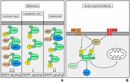 Regulation of PTPIP51 in melanoma. The left panel depicts the regulations of PTPIP51 in normal nevi. The phosphorylation level of the Tyr176 residue is low due to the high interaction with PTP1B. The phosphorylation of the Ser46 residue of PTPIP51 via PKA and the low phosphorylation level of the Tyr176 residue induce the formation of the PTPIP51/14-3-3β (not depicted)/BRAF complex and thereby a stimulation of the MAPK pathway. In the progression of the dysregulation of signaling as represented by the dysplastic nevi, the phosphorylation of PTPIP51 at Tyr176 is upregulated and thus inhibits the MAPK pathway stimulation of PTPIP51. This potentially mirrors a counter-regulation against the dysregulated growth and proliferation signaling in dysplastic nevi (middle panel). In melanoma cells the regulation of the phosphorylation and the interactions of PTPIP51 lie in between the normal nevi and the dysplastic nevi. This depicts the complete dysregulation of signaling since the counter-regulation of MAPK pathway via PTPIP51 phosphorylation is also deregulated (black arrows indicate a phosphorylation/interaction) (A); regulation of PTPIP51 interactions in acute myeloid leukemia. Activating mutations of the FMS like tyrosine kinase 3 (FLT3) receptor induce an activation of the Src family kinase Lyn. Lyn phosphorylates the Tyr158 and the Tyr176 residue of PTPIP51, which inhibit the formation of the Raf-1/14-3-3β/PTPIP51 complex and thus the MAPK pathway stimulation of PTPIP51. In acute myeloid leukemia blasts the N-terminus of PTPIP51 is missing. Therefore, the PTPIP51 protein does not contain the TMD. Due to the loss of the TMD a translocation to the mitochondrion is not possible and the apoptosis-inducing function of PTPIP51 is omitted (black arrows indicate a phosphorylation/activation, arrows with vertical bar as arrow head indicate an inhibition of interaction/activation) (B).