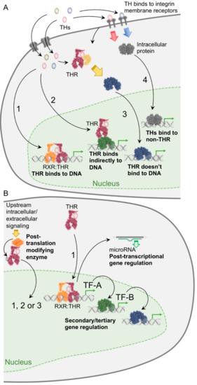 Type 1 transcriptional regulation is the predominant mechanism for TH-mediated regulation of transcription; however, the presence of cytosolic THRs has raised the possibilities for other THR interactions with cytoplasmic proteins [41]. Moreover, these interactions could initiate intracellular signalling as well as generate or remove post-translational modifications of THRs in the cytoplasm as well as in the nucleus [39,40]. One major post-translational modification is the phosphorylation of THRs, which occurs in both the cytoplasm and the nucleus. Phosphorylation of THR increases the THR heterodimerization with RXR and enhances the THR stability and target gene transcription [42,43,44]. However, transcriptional effects of phosphorylation still require THR binding to DNA so they should be considered a subset of Type 1 transcriptional regulation. Other types of post-transcriptional modifications such as acetylation and sumoylation have also been described, and appear to enhance the THR-mediated transcriptional activity [6,45,46]. Thus, post-translational modification of THRs may, in certain cases, be a prerequisite for Types 1–3 transcriptional regulation.