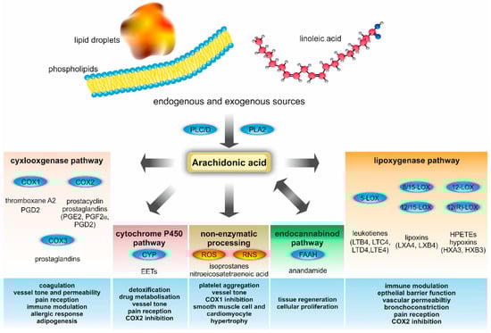 Various foods serve as an exogenous source of AA for humans. Lean meat and meat fats, eggs, salmon and tuna contain high concentrations of AA [22,23,24], and AA is also derived from linoleic acid, an essential fatty acid, which is mainly found in vegetable oils and walnuts [25]. Endogenous AA generation mainly occurs via the release of AA from cell membrane phospholipids. This process is catalyzed by enzymes of the phospholipase A2 (PLA2) superfamily and is induced by various cellular activation signals, including inflammation or infection driven tumor necrosis factor receptor (TNFR) and toll-like receptor 4 (TLR4) stimulation [26,27]. Among the PLA2 enzymes superfamily, three members contribute to eicosanoid production and are involved in distinct functions of eicosanoid metabolism. The cytosolic Ca2+ dependent PLA2 (cPLA2) alpha mainly drives free fatty acids (FFAs) production and generation of AA, which is involved in cellular signaling. The cytosolic Ca2+ independent PLA2 (iPLA2) alpha contributes to cellular homeostasis via the synthesis of specialized pro-resolving mediators (SPMs) and reacylation of free AA, and the secretory PLA2 (sPLA2) controls free AA release and induces the local inflammatory response in a paracrine manner [27,28]. In addition to PLA2, two other phospholipase families, namely phospholipase C (PLC) and phospholipase D (PLD), generate AA via intermediate products such as diacylglycerol (DAG) [29,30]. Finally, endocannabinoids serve as an endogenous source for AA, as demonstrated by the generation of AA from anandamide [31].