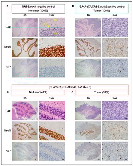 We investigated the role of AMPKα2 in vivo in medulloblastoma using the [GFAP-tTA;TRE-SmoA1] genetically engineered mouse model of SHH-driven medulloblastoma [,] in combination with the AMPKα2 KO mouse []. We note that, as previously described [], AMPKα2 KO mice are born with the expected Mendelian ratio, are fertile, appear indistinguishable from their WT littermates, and have a normal lifespan. Accordingly, AMPKα2 KO mice exhibit normal cerebellar development with properly tri-laminated cerebellar cortex (molecular, Purkinje cell and internal granular cell layers). Three groups of C57BL/6 mice were analyzed: (a) TRE-SmoA1 mice: the oncogenic gain-of-function allele of Smo, i.e., SmoA1, is not expressed in the absence of GFAP-tTA in these negative control group mice; (b) [GFAP-tTA;TRE-SmoA1] mice: all mice develop medulloblastoma in this positive control group; (c) [GFAP-tTA;TRE-SmoA1;AMPKα2−/−] mice: this test group allows us to assess the extent to which AMPKα2 KO modulates tumor incidence. Genotyping data for each group is shown in Figure S1. For each study group, we performed histological (Figure 1) and survival (Figure 2) analyses.