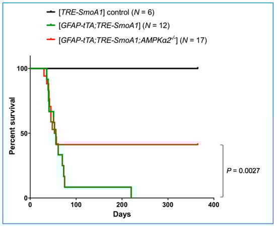 We studied medulloblastoma tumorigenesis in the absence or presence of AMPKα2 in the previously published bitransgenic [GFAP-tTA;TRE-SmoA1] model [,], where the expression of the tetracycline-regulated transactivator (tTA) is driven by a GFAP promoter and the expression of oncogenic SmoA1 is under the control of the tetracycline responsive element (TRE). The experimental breeders used in this study were an AMPKα2 KO mouse [], a TRE-SmoA1 mouse [], and a GFAP-tTA mouse [], all of which were maintained on a C57/BL6 background for at least five generations prior to initiating experiments. TRE-SmoA1, [GFAP-tTA;TRE-SmoA1], and [GFAP-tTA;TRE-SmoA1;AMPKα2−/−] mouse littermates were generated by crossing [GFAP-tTA;AMPKα2+/−] mice with [TRE-SmoA1;AMPKα2+/−] mice. Animals that meet the guidelines for end-stage illness and/or found to be at protocol endpoint (evidence of large tumor formation, enlarged dome head, and/or severe neurological dysfunction) were humanely euthanized in accordance with the institutional guidelines for the welfare of experimental animals. Maintenance of mouse colonies and experimental procedures were approved by the University of Michigan Committee on the Use and Care of Animals.